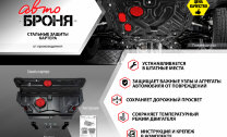 Стальные защиты Автоброня надежно защищают ваш автомобиль от повреждений при наезде на бордюры, выступающие канализационные люки, кромки поврежденного асфальта или при ремонте дорог, не говоря уже о загородных дорогах.