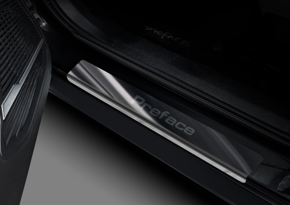 Накладки на пороги AutoMax для Geely Preface I поколение (FS11) 2024-н.в., рынок РФ, нерж.сталь, с надписью, 4 шт., AMGEPRE01
