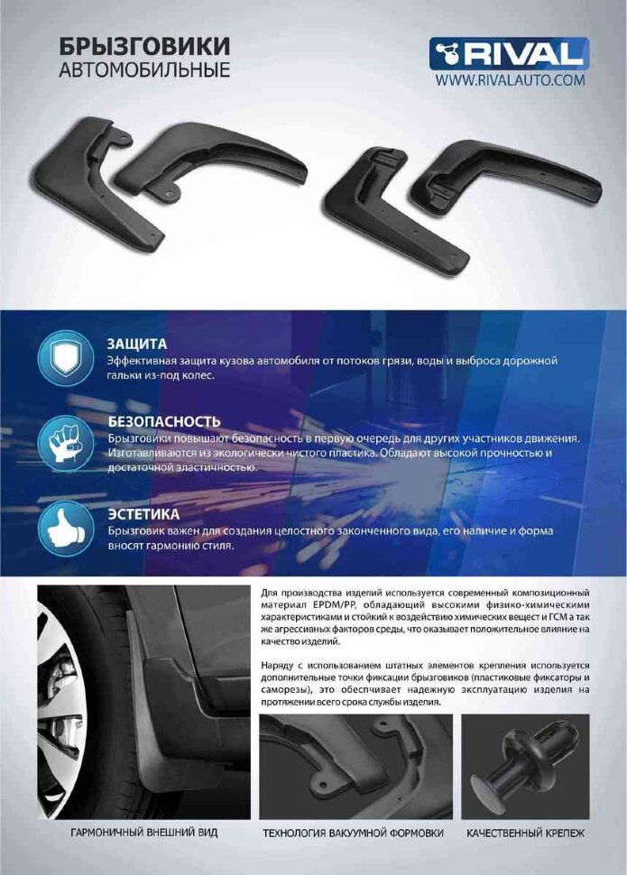 Автомобильные брызговики - важный аксессуар для комфортной и безопасной поездки. Брызговики Rival предотвращают коррозию и преждевременный износ нижней части кузова от брызг, реагентов и мелких камней, а также препятствуют попаданию частиц дорожного покрытия, которые вылетают из-под колёс, в идущие позади автомобили.
