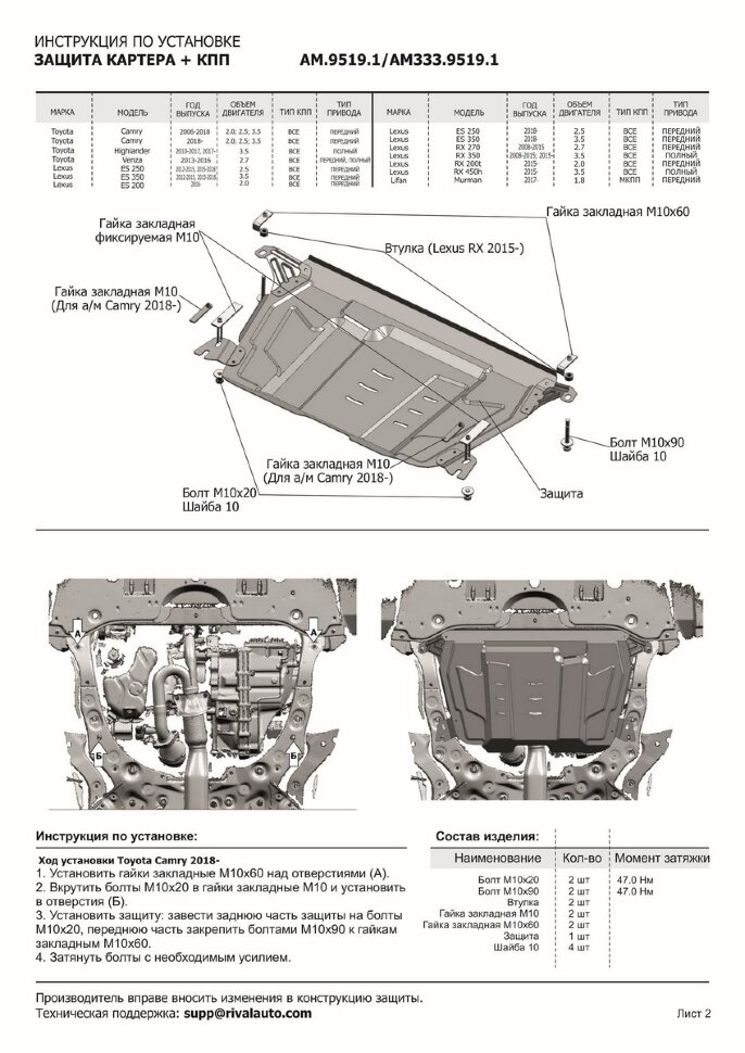 | Комплектность | защита - 1 шт., комплект крепежа, инструкция по установке, упаковка |