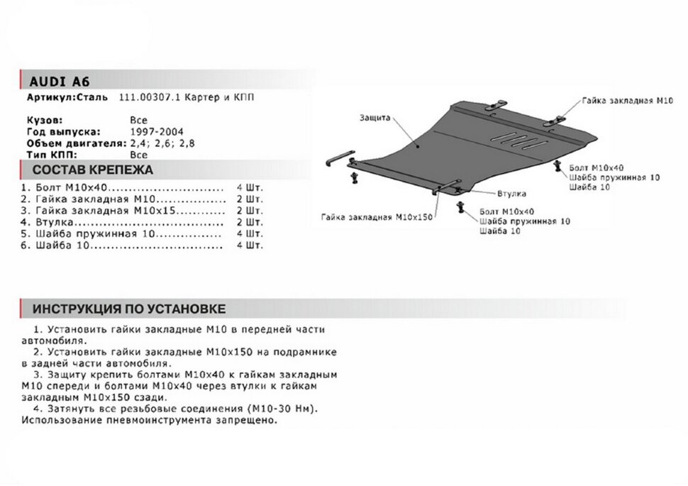 | Комплектность | защита - 1 шт., комплект крепежа, инструкция по установке, упаковка |